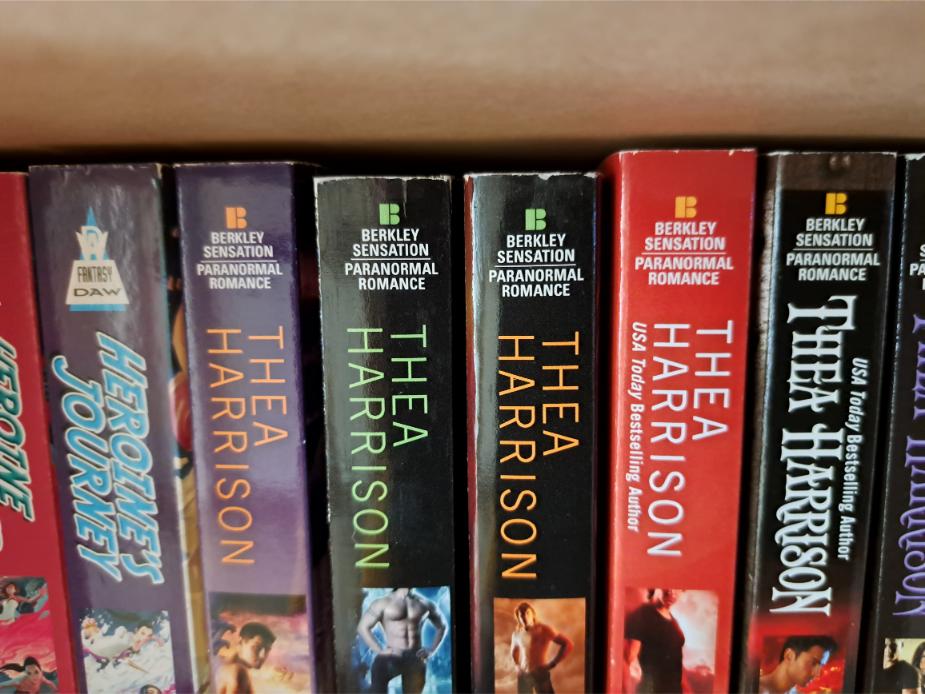 Soms is het hoogteverschil van boeken zo klein dat je ook echt niet snapt waarom ze die aanpassing hebben gedaan. De eerste vier boeken van Thea Harrison hebben een zelfde opmaak terwijl boek 2 en 3 een heel klein beetje kleiner zijn dan de andere maar vanaf het vijfde boek is het lettertype op de rug plots helemaal anders.