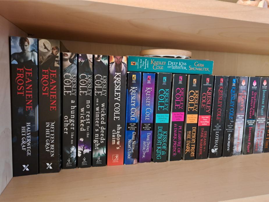 De series van Kresley Cole en Jeaniene Frost kampen met datzelfde probleem. Bij die laatste komt het grotendeels doordat de eerste twee boeken in het Nederlands uitkwamen maar de vervolgdelen niet langer vertaald werden en bij Kresley Cole komt het deels door een tweedehandse aanwinst waarbij ik voor een mooie prijs 14 boeken in één keer kon aanschaffen. Jammer genoeg met de eerste drie delen in een groter formaat. Shadow’s Claim vond ik enkele jaren later ook enkel in datzelfde grote formaat terug.