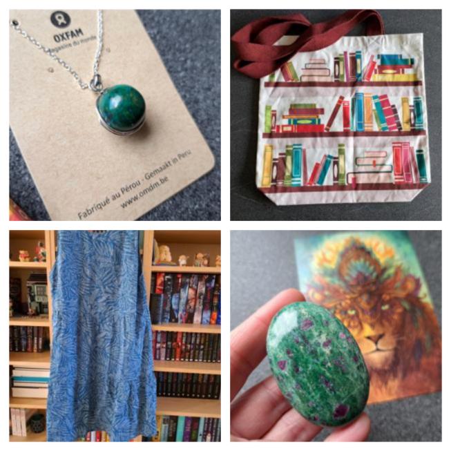 Nog een paar leuke vondsten zijn mijn Chrysocolla halsketting die ik bij de plaatselijke Wereldwinkel bestelde, plus de andere edelstenen die ik vooral bij Ananda in Utrecht vond. In de TK-Maxx van Eindhoven zag ik onverwachts deze mooie (maar vooral ook heel stevige én grote) totebag en bij onze plaatselijke Kringloopwinkel zag ik deze heerlijke comfortabele en hittegolf bestendige jurk.