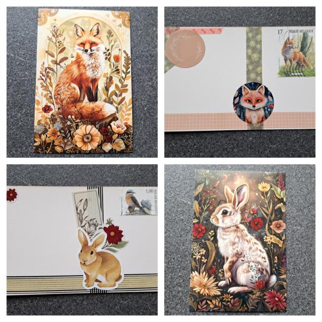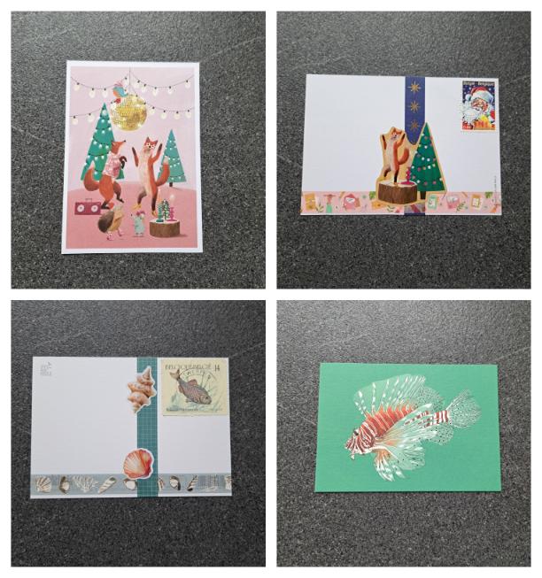 Bij de mensen die wel graag een geadresseerde postkaart mét boodschap ontvangen probeer ik steeds een postzegel te vinden die bij de versierde kaart past.