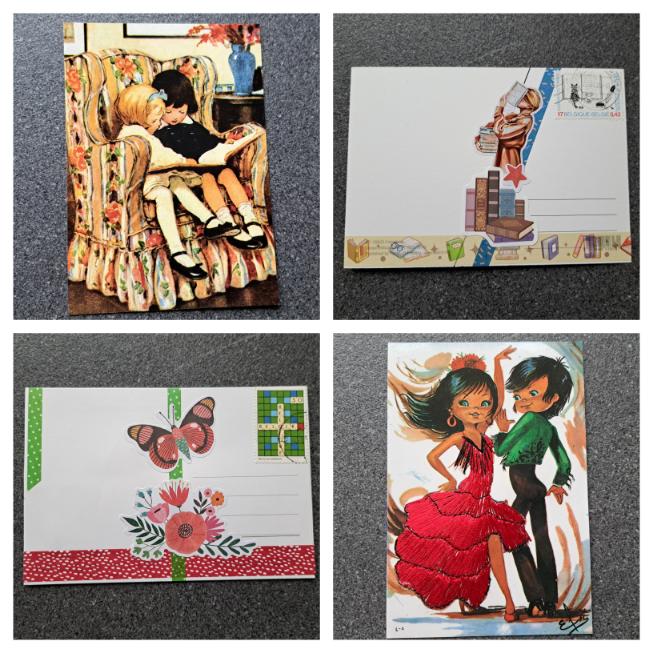 De kaart rechtsonder in bovenstaande collage vond ik bij de plaatselijke kringloopwinkel. Ik dacht echt dat meerdere mensen die zouden willen ruilen vermits de flamenco-jurk geborduurd is. Iets wat je niet vaak tegenkomt. Maar het duurde meer dan een jaar vooraleer iemand deze wilde ruilen.