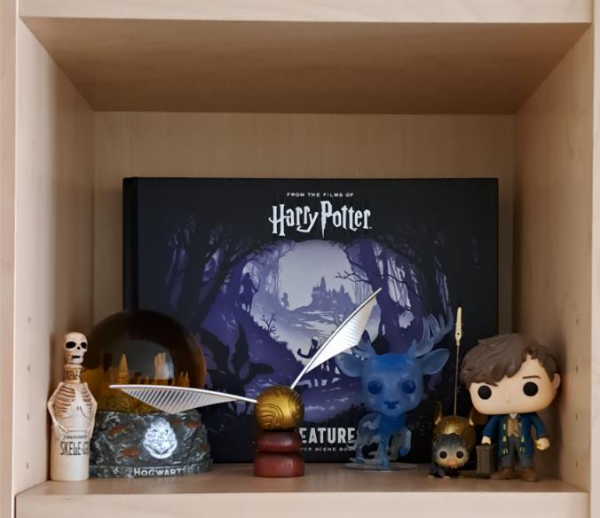 De plank daaronder bevat opnieuw een boek over de magische wezens uit Harry’s wereld maar dan een versie met een soort van schaduw-illustraties die tot stand komen door een combinatie van verschillende lagen papier. Er staan echter ook heel wat decoratieve zaken. Een mini Niffler Funko en eentje van Newt Scamander met zijn koffer én Hufflepuff sjaal, een sneeuwbol van Hogwarts, een Snitch foto-houder en een Snitch met gestrekte vleugels en een flesje Skele-gro. Plus de mooie Patronus Funko die ik ooit van lieve Nancy cadeau kreeg.