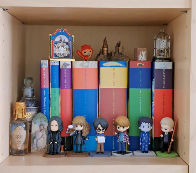 Op de plank daaronder staat mijn enige volledige Harry Potter serie in de editie waarin ik de boeken heb ontdekt. De eerste twee delen had ik oorspronkelijk met een zachte kaft maar na jaren zoeken heb ik ze uiteindelijk toch nog met een harde kaft kunnen bemachtigen (lang leve Awesome Books). Er staan ook Pop Marts van Severus, Hermione, Harry, Ron, Neville en Draco, een flesje Liquid Luck en eentje met Centaurea Cyanus, een magneet van The Fat Lady haar portret, een Lego replica van de familie Weasley hun bekende klok, een mini Funko van Fawkes, een wel heel klein Hogwarts lichtje, een nog kleiner exemplaar van Hogwarts a history en een klein beeldje van Hedwig in haar kooi.