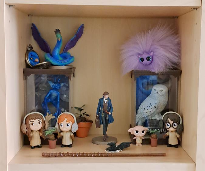 Maar ook mini Funko’s van Hermione, Ron en Harry in hun Herbology outfit en een beeld van Newt Scamander dat ook van HeroCollector is. Plus – niet te vergeten – mijn zelfgemaakte toverstaf.