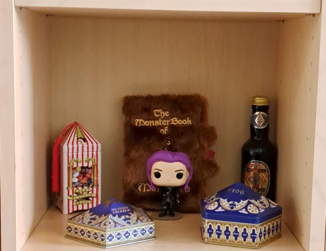 Nog niet zo lang geleden heb ik besloten om heel wat geurkaarsen weg te doen waardoor deze plank er een pak leger uitziet. De Funko van Tonks kreeg echter nog steeds gezelschap van een blikken doosje Every Flavour Beans van Bertie Botts en eentje van een Chocolate Frog waar ik ook nog een plastic doosje van heb staan. Plus een mooie flesje Butterbeer en een aaibaar notitieboek van The Monster Book of Monsters.