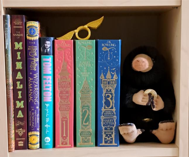 De laatste plank bevat mijn Readsy leesring in de vorm van een Snitch, een pluche Niffler, de drie eerste boeken uit de reeks in de prachtige MinaLima editie met interactieve elementen, Beyond the wand van Tom Felton, De Wizarding Almanac (die mooie illustraties heeft maar niet echt iets nieuws wist te melden), een non-fictie boek over Minalima en Christmas at Hogwarts.